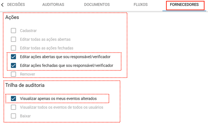 - Editar ações abertas que sou responsável/verificador: Permite editar apenas ações abertas onde o usuário é responsável ou verificador.