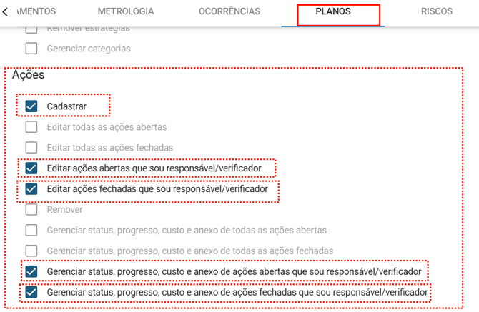 - Editar ações fechadas que sou responsável/verificador: Permite editar apenas ações fechadas onde o usuário é responsável ou verificador.