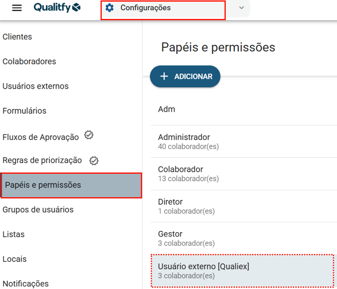 Para visualizar as permissões do usuário externo, acesse a aba “Papéis e Permissões” dentro do módulo Configurações e clique na opção Usuário Externo.
