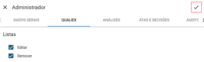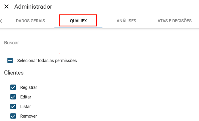 Selecione-o e acesse a aba Qualiex para atribuir as permissões que os usuários relacionados ao papel terão, referente as configurações: