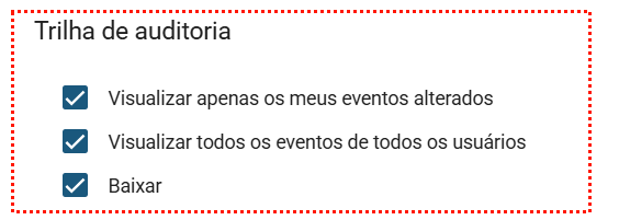 - Visualizar apenas os meus eventos alterados: Possibilita ao usuário visualizar a aba de 'trilha de auditoria' e consultar os eventos realizados apenas pelo seu próprio usuário.