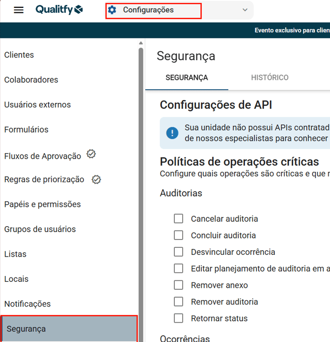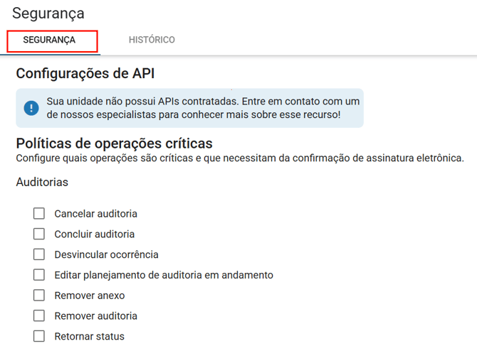 Auditorias: Aqui estão listadas todas as operações críticas do módulo Auditorias que podem ser habilitadas.