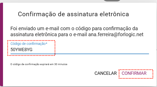 O código de confirmação será enviada via e-mail, o código é único e ele possui um prazo de 30 minutos para utilização, após esse prazo o código é expirado, sendo necessário cancelar e executar ação novamente, para o envio de um novo código de confirmação.