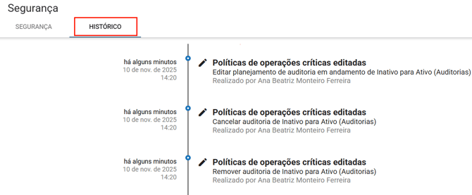 Ao lado da aba de segurança, temos a aba de histórico, onde constará todas as alterações realizadas na aba de segurança, como no print abaixo: