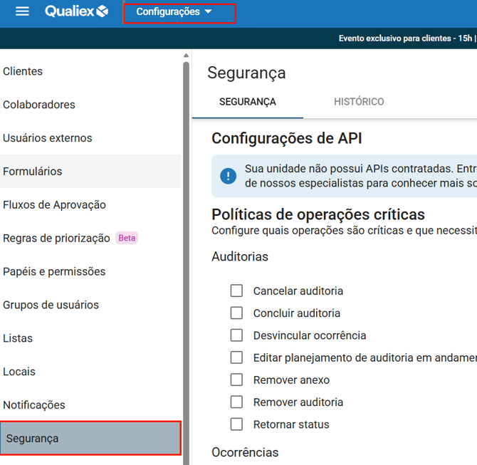 Ocorrências: Aqui estão listadas todas as operações críticas do módulo Ocorrências que podem ser habilitadas.