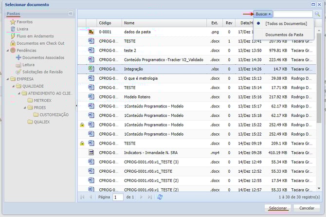 - Localize o documento navegando pelas Pastas ou pela Busca selecionando Todos os documentos.