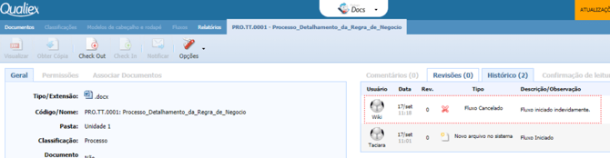 Ao cancelar o fluxo de um documento que já possui uma revisão, ele volta a ficar disponível para visualização apenas para as pessoas que têm permissão de visualizar a última revisão ativa.