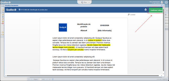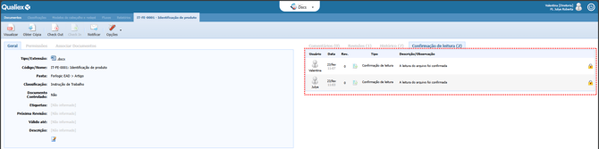 Os documentos que estão em fluxo ou com a confirmação de leitura habilitada devem ser visualizados e ter sua leitura confirmada, garantindo o controle e a rastreabilidade de quem tomou ciência do seu conteúdo.