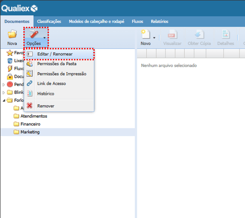 Para editar o nome de uma pasta/subpasta, é necessário possuir a permissão “Criar na Raiz” habilitada em Papéis nas configurações clássicas. Caso possua a permissão de acesso total à unidade, também será possível editar o nome de uma pasta/subpasta