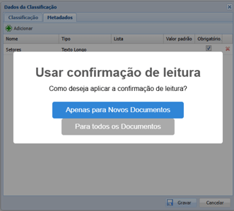 Usar confirmação de leitura: define se a confirmação de leitura será obrigatória ou não para documentos com essa classificação. Ao alterar essa opção, será necessário informar se a mudança será aplicada apenas para novos documentos ou para todos os documentos que já foram enviados com essa classificação.