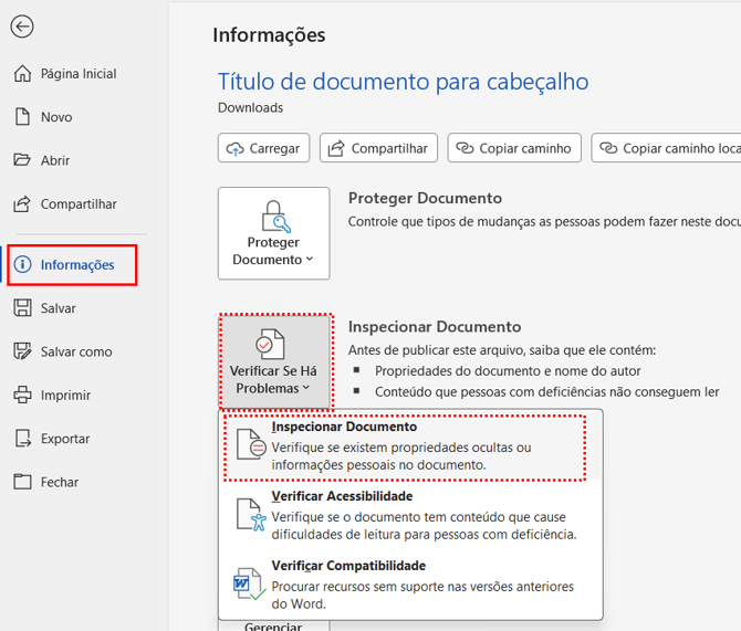 - Clique em Verificar Problemas e selecione a opção Inspecionar Documento.