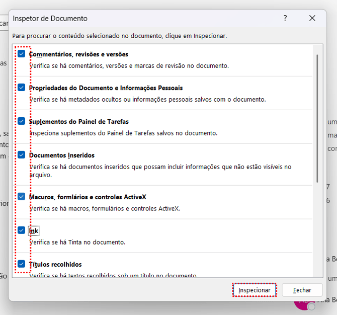 - Na tela do Inspetor de Documentos, marque marque as opções que serão verificadas. Clique em Inspecionar.