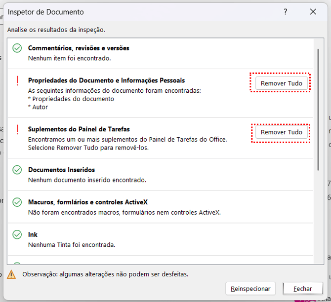 Recomenda-se inspecionar uma cópia do documento original, pois nem sempre é possível restaurar os dados que o Inspetor de Documentos remove.