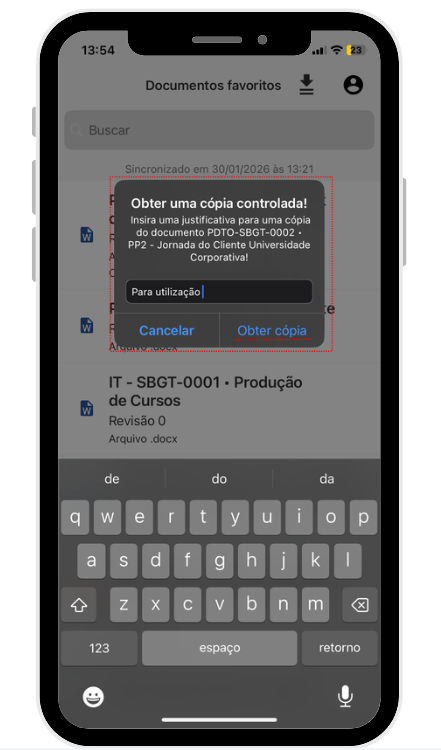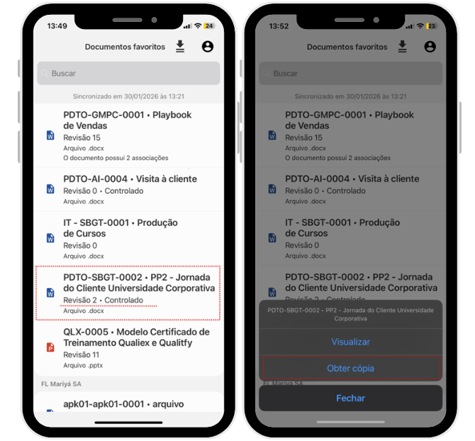 Os documentos que possuem cópia controlada exibem a indicação "Controlado" após o número da revisão. Toque no documento desejado e selecione a opção "Obter Cópia".