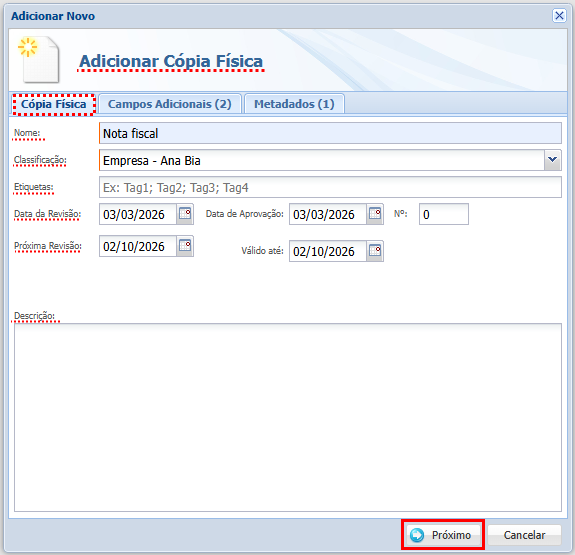 - Próxima Revisão: Indica a data da próxima revisão do documento, conforme cadastrado na classificação do documento.