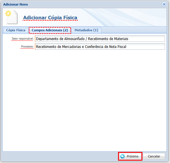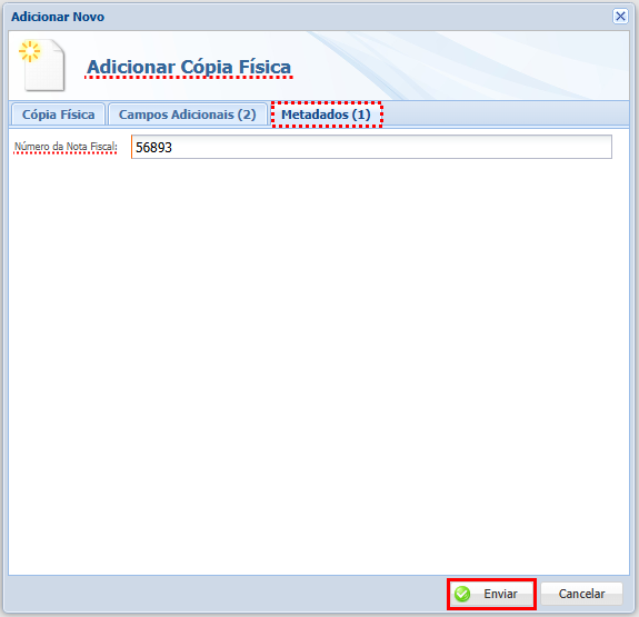 Caso tenha um metadado configurado na classificação selecionada será exibido para preenchimento, na aba "Metadado".