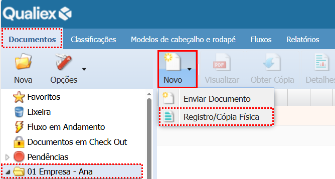 Para registrar um documento do qual possuo apenas a cópia física, é necessário ter a permissão “Enviar novo" documento . Definida em Opções > Permissões da Pasta.
