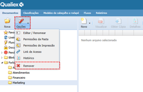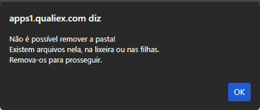 Para remover uma pasta, ela não pode conter subpastas, deve estar vazia (sem documentos) e não pode conter arquivos removidos desta pasta na lixeira. Caso contrário um alerta será emitido