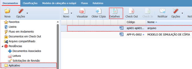 Na aba “Documentos”, clique sobre a pasta desejada e escolha o documento. Ao selecionar o documento, na barra de opções acima, clique em “Detalhes”.
