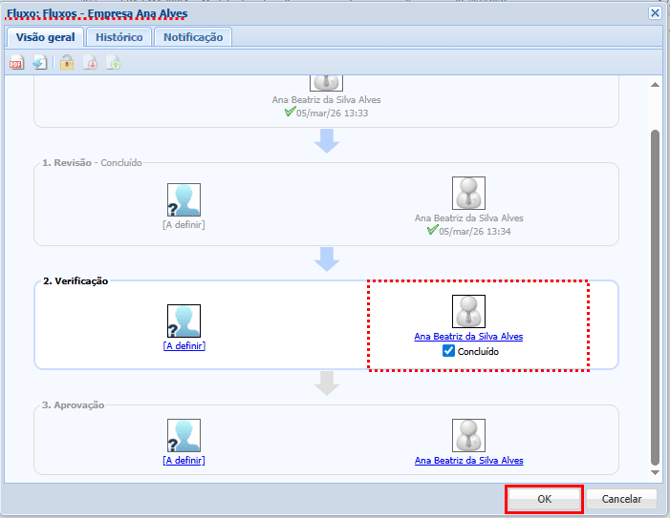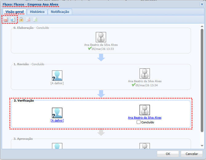 Ao clicarmos será exibida a janela para que possamos visualizar todas as etapas do fluxo e darmos andamento. Na etapa de verificação não é permitida a alteração do documento somente a visualização, assim apenas a opção de PDF e obter cópia estarão habilitada.