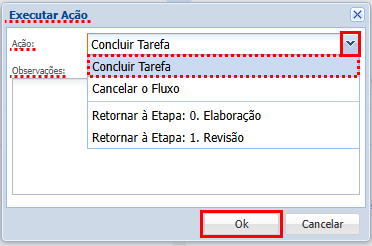 Desta forma será exibida uma janela com as opções para dar andamento no fluxo. Clique em