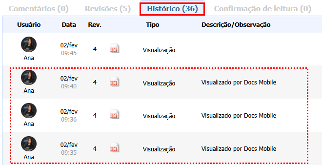 Quando temos a visualização de um documento no aplicativo, essa operação fica registrada nos detalhes do documento no Docs Web, conforme imagem abaixo.