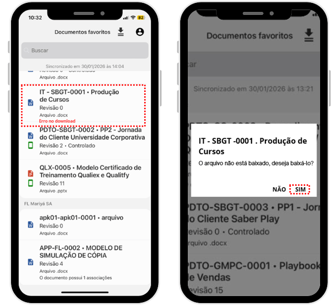 Nesses casos, os documentos com download inconsistente serão sinalizados com a mensagem "Erro no download". Quando a conexão com a internet for restabelecida, clique novamente no documento para tentar sincronizá-lo.