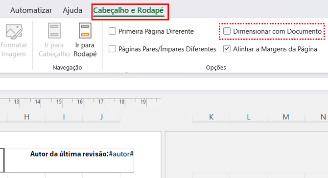 Restrições para aplicação do cabeçalho e rodapé em documentos .xlsx