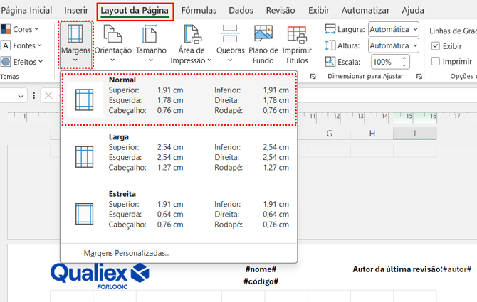 Modelo de cabeçalho e rodapé no Excel