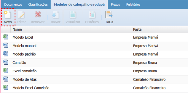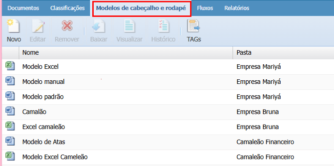No Docs podemos criar modelos de cabeçalho e rodapé que são aplicados nos documentos automaticamente. Os modelos são vinculados por pasta ou classificação.