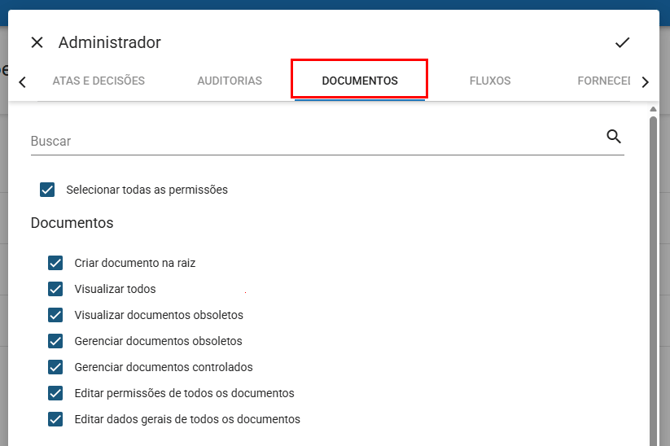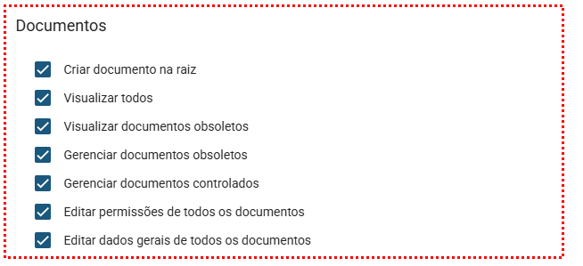Gerenciar categorias : Essa permissão concede ao usuário acesso total à administração das categorias utilizadas no módulo de Documentos.