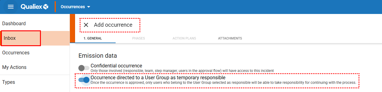 During the occurrence approval process, through the Inbox, you will find the option to temporarily assign responsibility to a user group.
