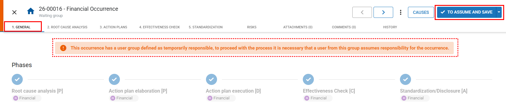 To take ownership directly within the occurrence record, open the occurrence and you will be taken straight to the General tab. In this case, the “Save and advance” button will be replaced by “To assume and save” on all tabs.