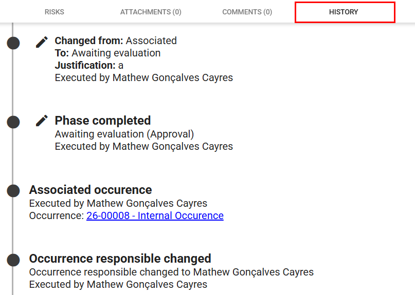 When accessing an occurrence, you can review its entire change history, ensuring transparency and full traceability of all actions performed.
