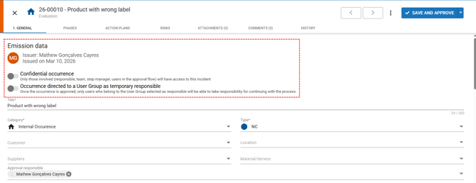Regarding the occurrence owner, if at the beginning it was defined that the occurrence will be assigned to a user group as a temporary responsible, then in the Approval Responsible field it will be possible to select the group instead of an individual user.