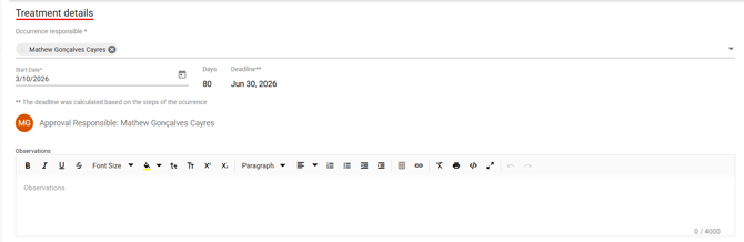 Start date (mandatory): Define the start date of the treatment. Based on this date, the completion deadline will be automatically calculated according to the configuration of the category linked to the occurrence.