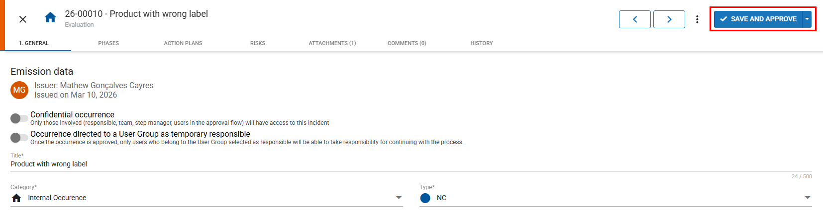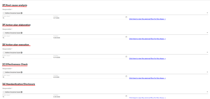 Phase responsible(mandatory): When the overall occurrence owner is defined on the General tab, the phase responsible fields are automatically populated with the same responsible person. However, it is possible to customize and assign a different owner for each phase.