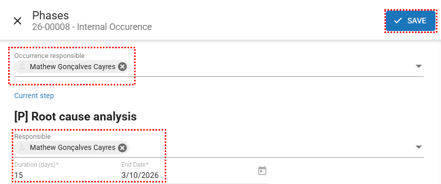 To change the responsible person or the deadline of an occurrence, the user must be the approver, the person responsible for the occurrence, or have the “Edit All” permission, defined under Configurations > Roles and Permissions.