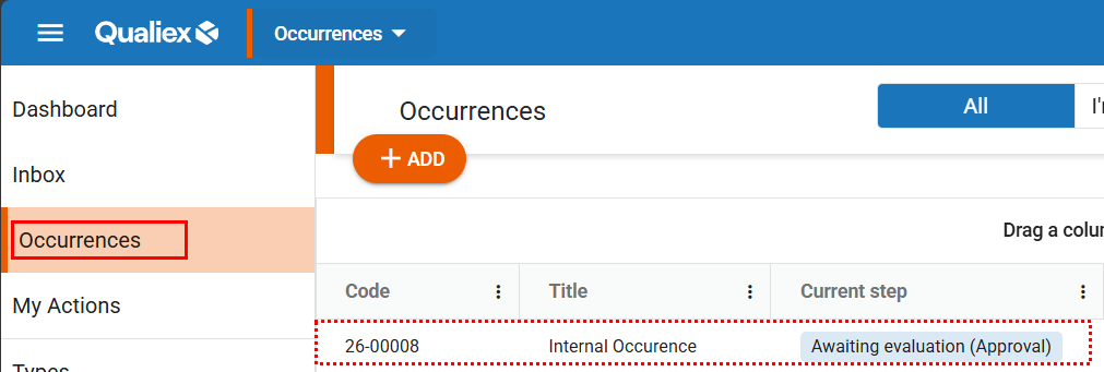New occurrences created with that category and an approval flow configured will appear in the Occurrences tab with the current step marked as “Awaiting Evaluation (Approval).”