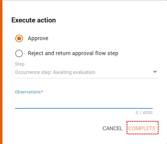 At this stage, it is possible to approve the step, reject it, or return it to a previous phase — either within the same approval flow or to any other step of the occurrence. You must also record your feedback, which is mandatory, providing even more flexibility and control in the management of occurrences.
