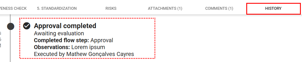 Whenever a step in the approval flow is approved or rejected, this information is recorded in the occurrence’s history, allowing for easy consultation.