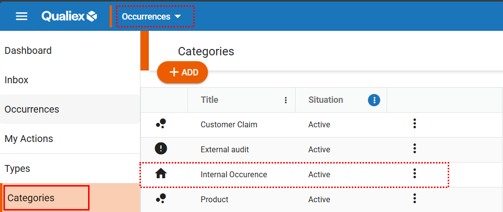 After accessing the Occurrences module, you will see the Categories tab in the left‑hand column.