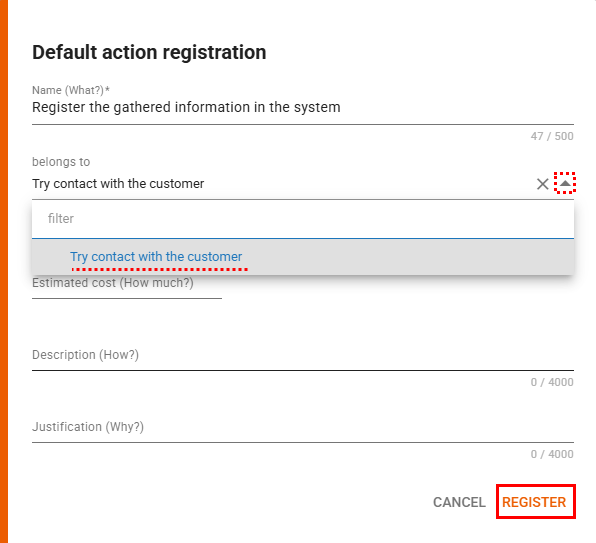 If a standard action has already been registered, the registration window for new actions will display the “Belongs to” field, allowing you to indicate that the new action is related to an existing one.
