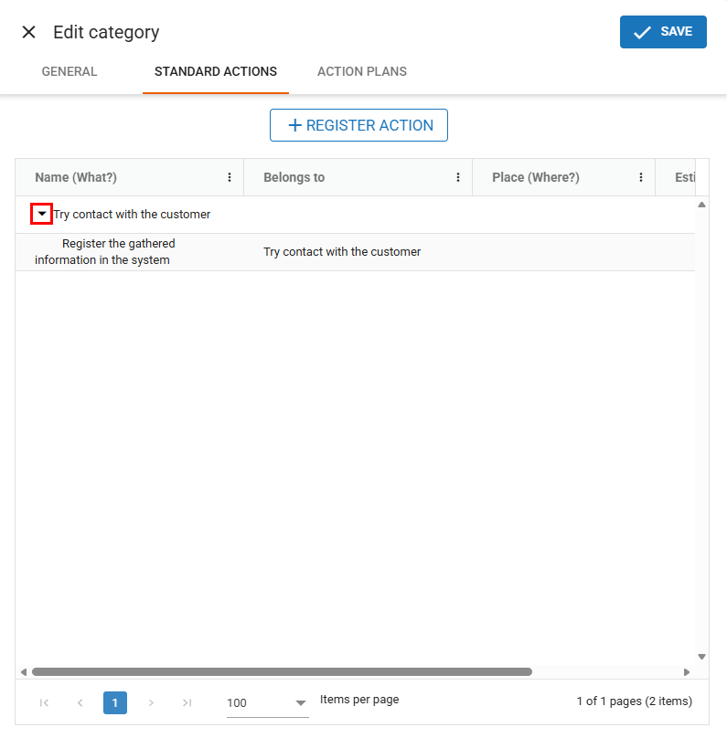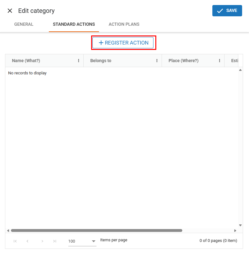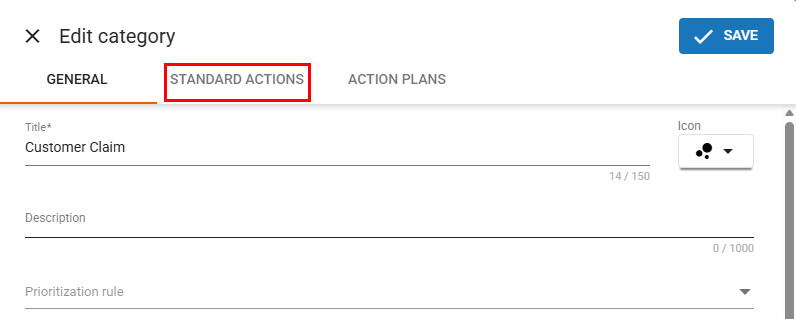 Click the “Standard Actions” option to open the tab for managing the standard actions of the selected category.