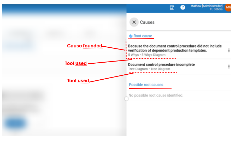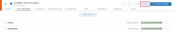 In the Cause Analysis step, click “Causes” to view the possible causes and root causes that have been identified.