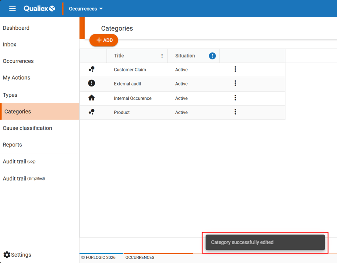 After clicking “Save,” the category will be updated and a confirmation message will appear: