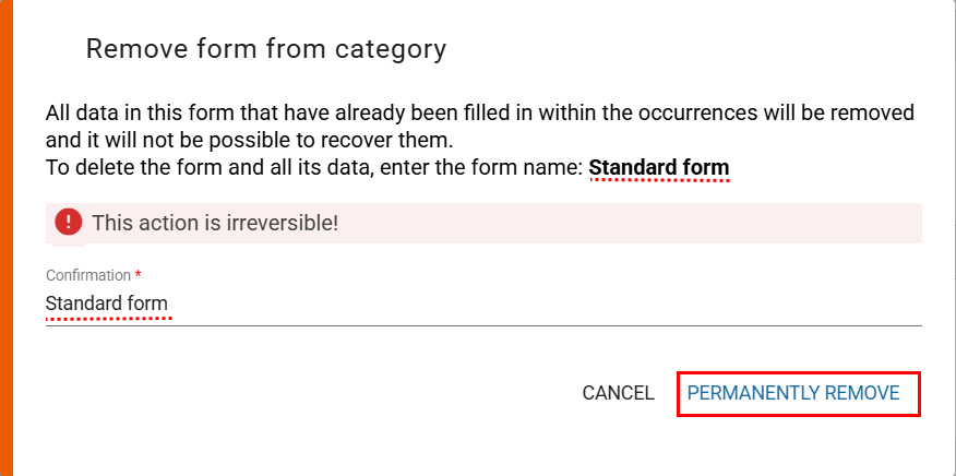 To confirm and acknowledge that all records entered in the form fields will be permanently deleted (with no possibility of recovery), you must type the form name in the “Confirmation” field (as shown in the image below).