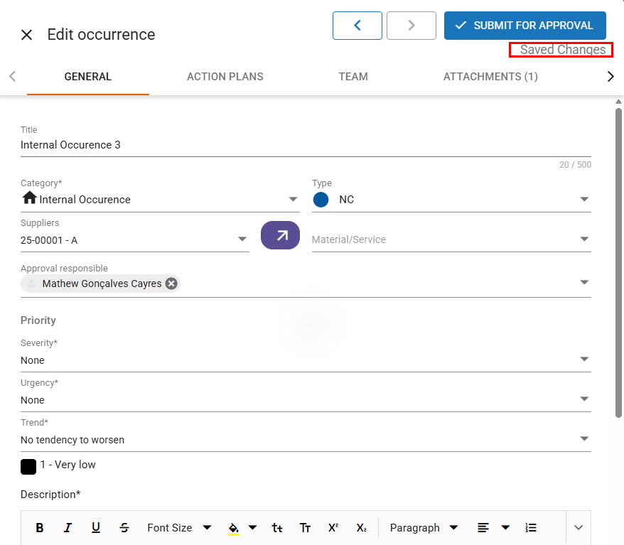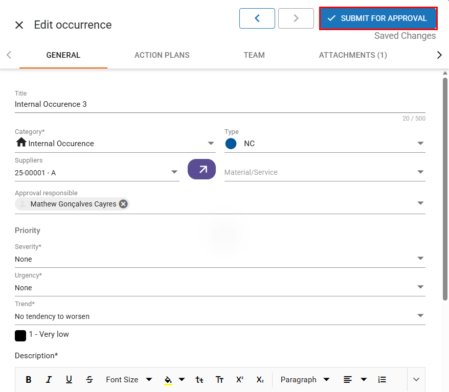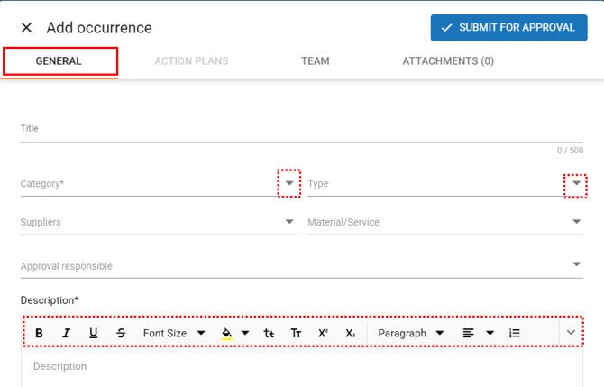 Category (required): select the category for the occurrence. During the approval stage, the responsible approver may change it if necessary.