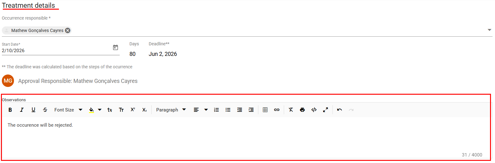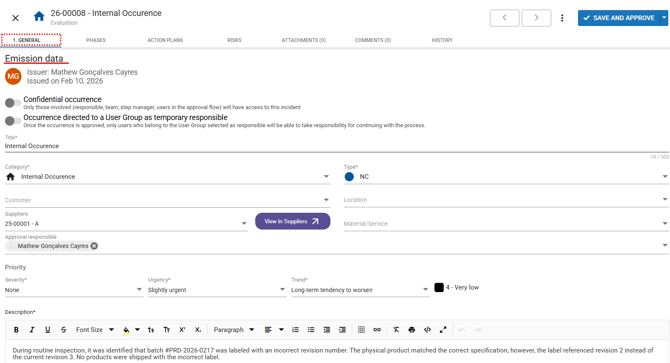The approver may review and edit the data entered in the occurrence description fields: title, category, type, customer, location, suppliers, material/service, approval responsible, description.