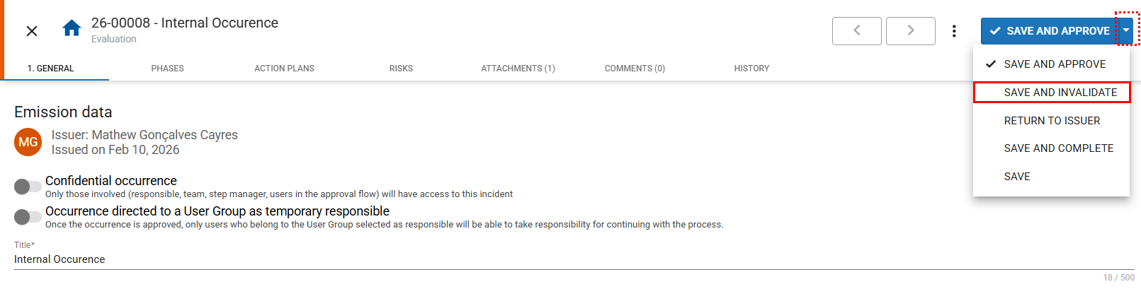 When the occurrence evaluation screen opens, you will have access to the General tab, where you will find the occurrence issuance data, handling details, and the team involved.